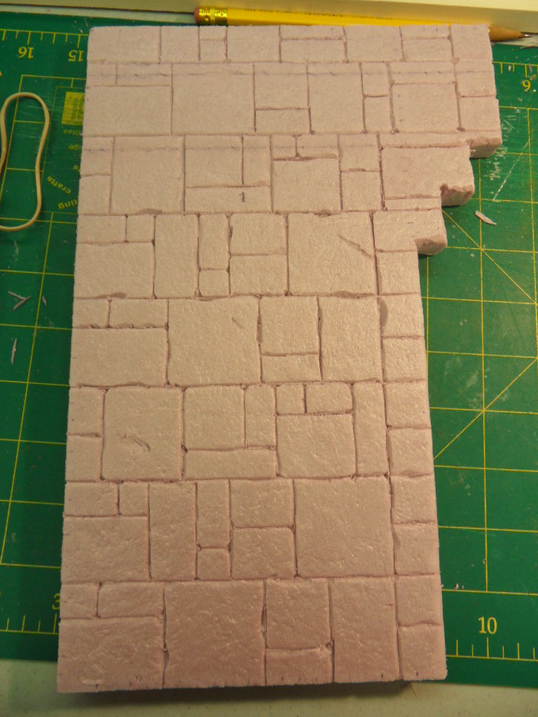 Then I moved on to carving my first stone wall. Again I laid out a pattern on graph paper first, then drew it on the wall using a ball point pen, and again I made a mistake, but once it’s painted you won’t see the two lines that are drawn in the wrong spots!!