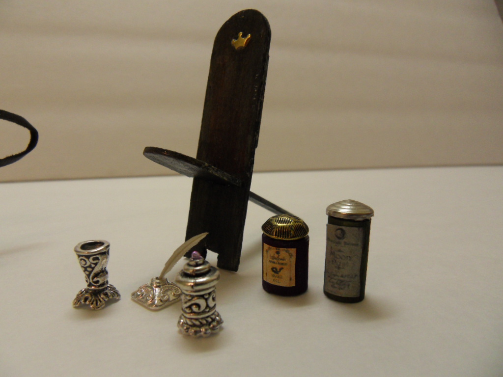 During our lunch break we got another bag of tidbits from the other attendees. Again I received some wonderful items. A beautiful wood candlestick with dripping candles, a leather bound book and feather pen, a Tudor styled water jug in a carrying strap, a beautiful hand turned pottery bowl, “silver” desk accessories, some jar of potions, and a beautiful Tudor chair. The chair came with a note explaining it was Mistress Ann’s Bogchair. The original was built for Mistress Ann by Lord Sylan of Thor’s Mountain – to be potable and set up at different garden events – so that Mistress Anne could use it for the whole event she attended!